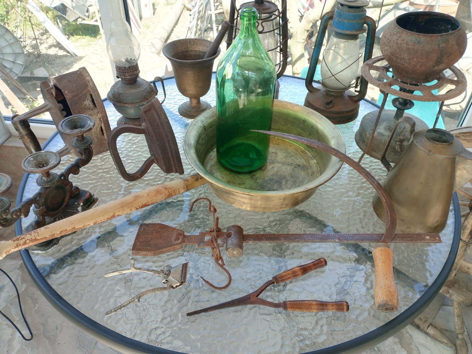На столах расположены военные реликвии: каски советских и немецких солдат, котелки, гильзы, пулемётные ленты, осколки снарядов, портсигары и прочее.