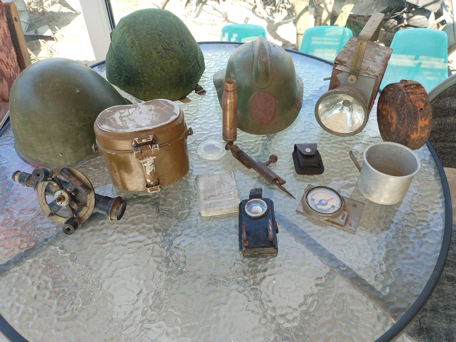На столах расположены военные реликвии: каски советских и немецких солдат, котелки, гильзы, пулемётные ленты, осколки снарядов, портсигары и прочее.