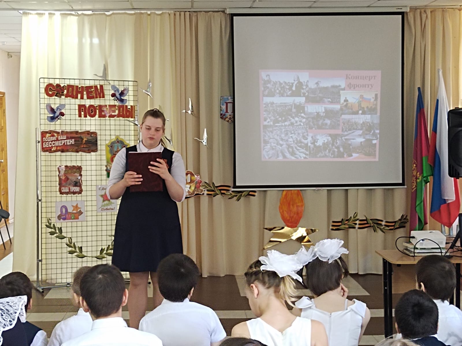 В программе праздника прозвучали известные песни военных лет, которые в самое трудное и мрачное время помогали и поддерживали солдат на поле боя, давали надежду женам, матерям и детям, работающим в тылу. Ребята слушали стихи о героизме русских солдат и с воодушевлением посмотрели интересные видео презентации, подготовленные учителем истории Малаховой Е.П..