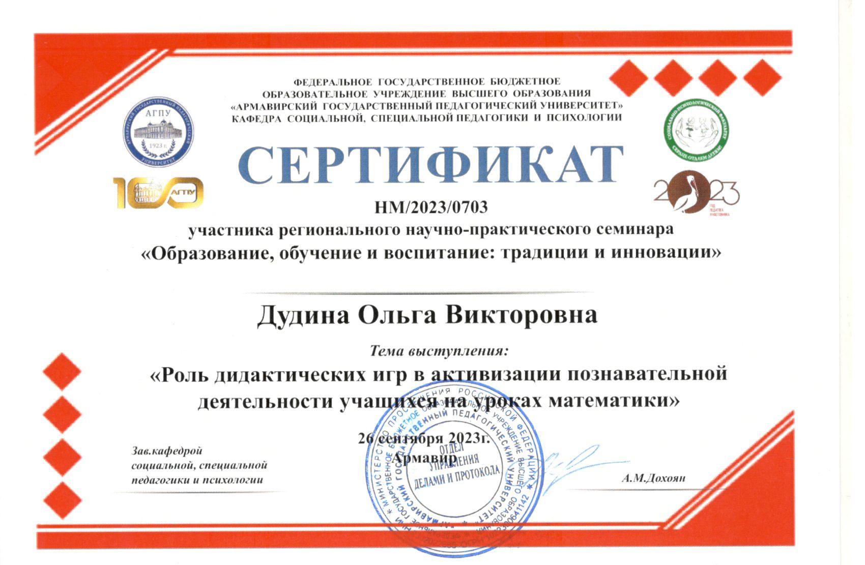 Статья «Игровые технологии как средство развития познавательной активности учащихся на уроке математики», сборник материалов II региональной научно-практической конференции «Современное образование: опыт, проблемы, перспективы»(27 сентября 2022 г., Армавир) / с. 38 — 40